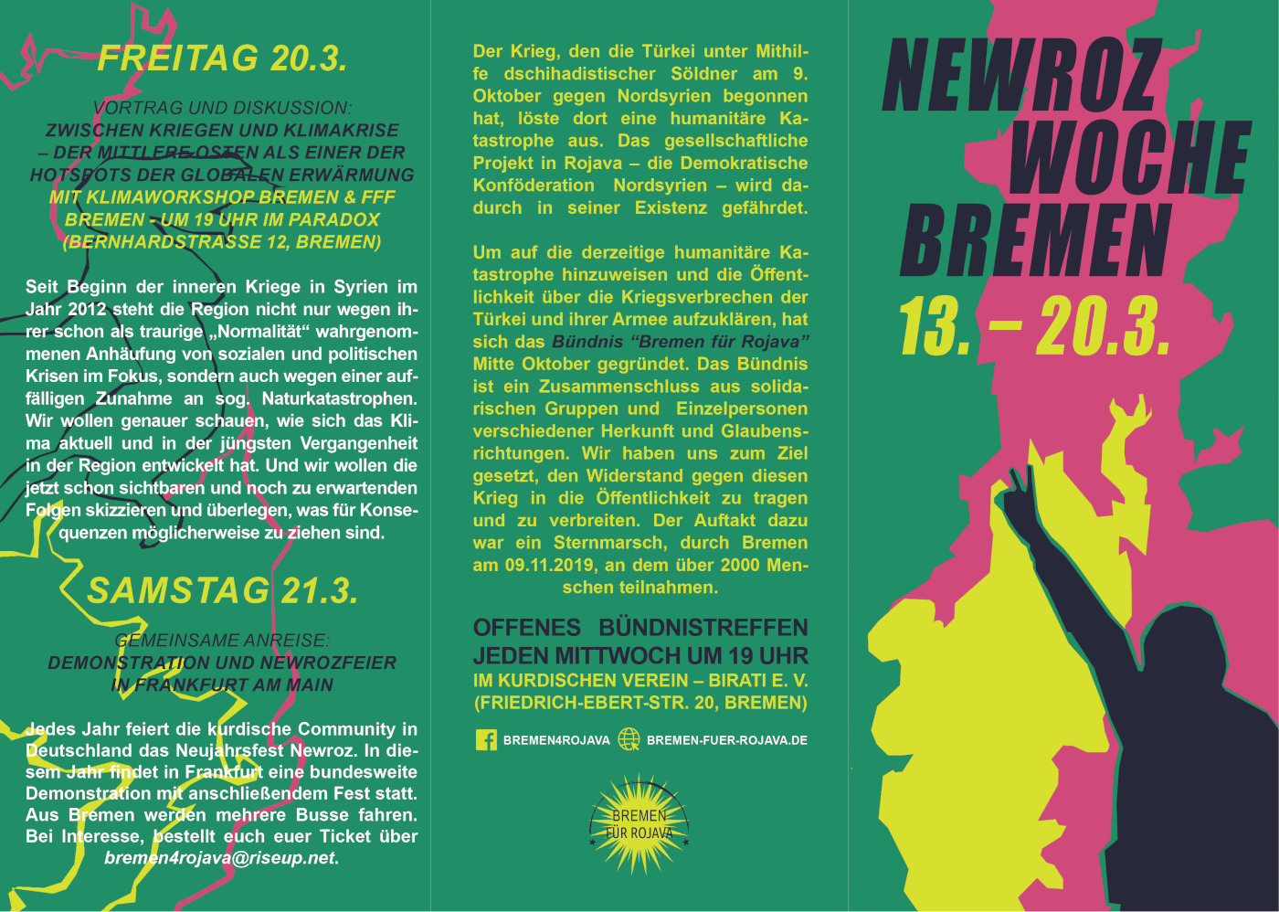 Das Bündnis Bremen für Rojava lädt ein zu einer Newroz-Woche mit Kino, Vorträgen und Diskussionen, einer Kunstauktion, einer Newroz-Feier in Oldenburg und der gemeinsamen Fahrt zur zentralen Newroz-Demo in Frankfurt am Main!