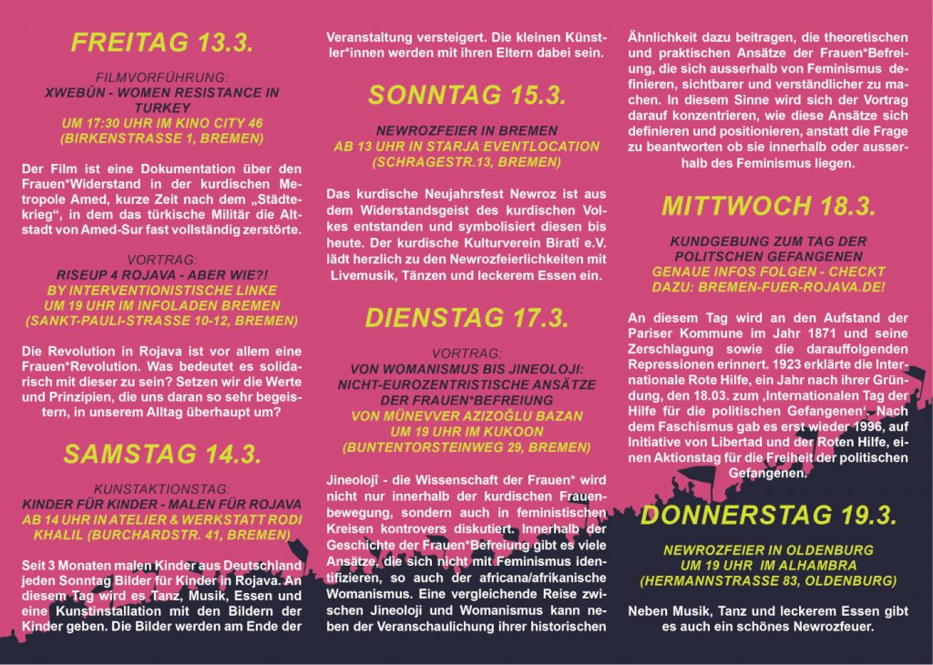 Zum Auftakt zeigt das City46 diesen Freitag, am 13.3. um 17:30 Uhr, den Film „Xwebun“. „Xwebun“ heißt „Selbst-Sein“, der Film beschreibt den Frauenwiderstand in der kurdischen Metropole Amed in Kurdistan/Türkei in der Zeit nachdem „Städtekrieg“ 2016, in dem das türkische Militär die Altstadt von Amed, den Stadtteil Sur, fast vollständig zerstörte. Gezeigt werden Frauen der Frauenakademie von Amed, Journalistinnen derFrauen-Nachrichtenagentur JINHA und viele andere. Vor dem Film gibt es eine kurze Einführung und danach Gelegenheit fürFragen und Diskussion. Direkt danach, um 19 Uhr im Infoladen, diskutiert die Interventionistische Linke, was Solidarität mit der Frauenrevolution inRojava bedeutet – und ob wir die Werte, die uns daran begeistern, in unserem Alltag eigentlich umsetzen. Weiter geht es am 14. 3. mit einer Auktion von Kinderbildern, die Kinder in Bremen in Solidarität mit den Kindern in Rojava in den letzten Monaten gemalt haben – um 14 Uhr im Atelier Rhodi Khalil in der Burchardstr. 41. Am 17.3. trägt Münevver Azizoglu-Bazan, die an der Uni Bremen zur kurdischen Frauenbewegung promoviert, über einen Vergleich von Jineologiund Womanism vor – um 19 Uhr im Kukoon. Am 18.3. gibt es vor der Glocke an der Domsheide eine Kundgebung zum Tag der politischen Gefangenen, denn Repression und politische Verfolgung betreffen auch die kurdische Bewegung hierzulande. Am 20.3. beleuchten Klimaworkshop Bremen und Fridays for Future gemeinsam die Thematik „Zwischen Kriegen und und Klimakrise – der mittlere Osten als einer der Hotspots der globalen Erwärmung“ – um 19 Uhr im Paradox.
