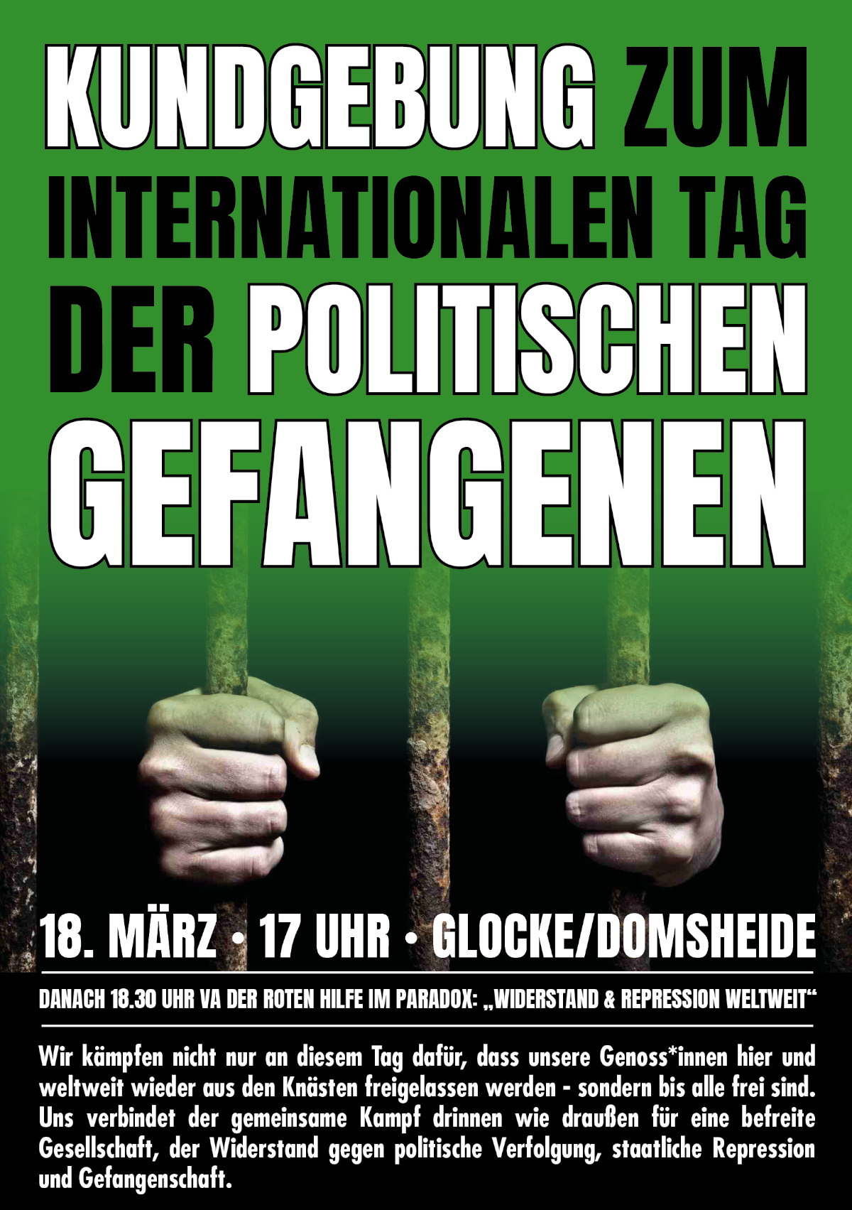 Deswegen rufen wir am 18.03.20, 17:00 Uhr, Glocke/Domsheide zu einer Kundgebung in Solidarität mit den politischen und revolutionären Gefangenen weltweit auf.