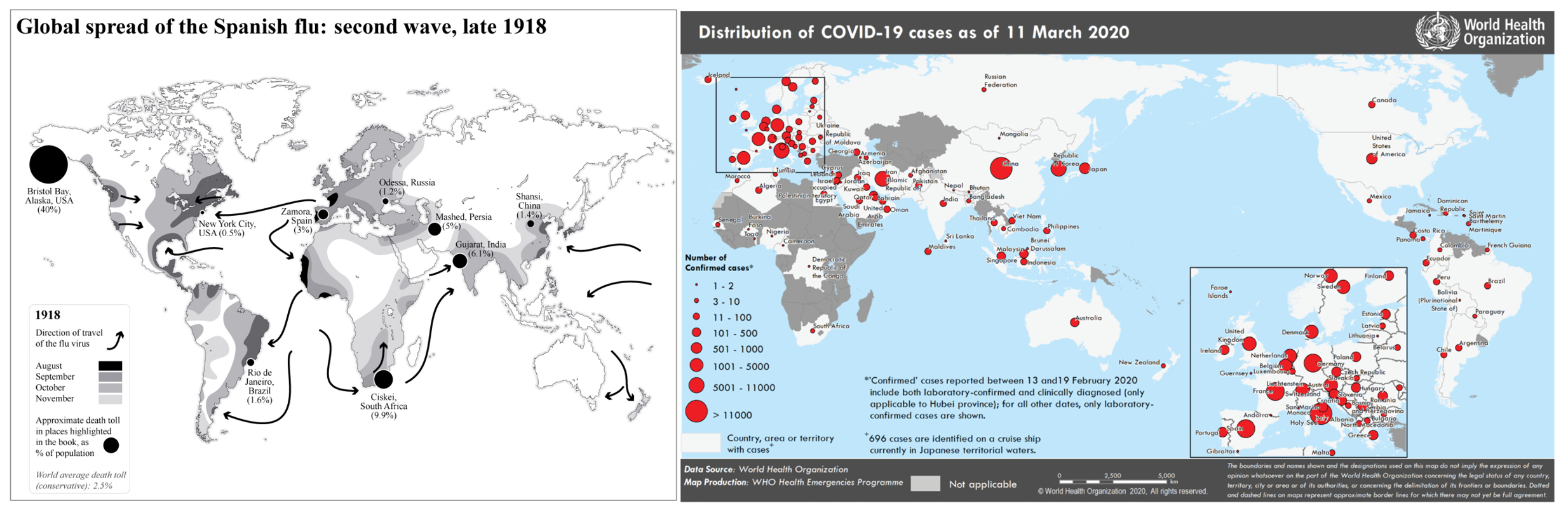 1918-1920: Bereits durch den Ersten Weltkrieg erschüttert, sah sich die Welt einem heimtückischeren Feind gegenüber: Die Spanische Grippe, eine katastrophale Pandemie, die 500 Millionen Menschen infizierte und bis zu 50 Millionen oder mehr Tote forderte – doppelt so viele Opfer wie durch den Krieg. [Übrigens treten Pandemien oft nach Kriegen und in Phasen massiver Ausbeutung, also prekärer Lebensbedingungen auf, mehr dazu hier]