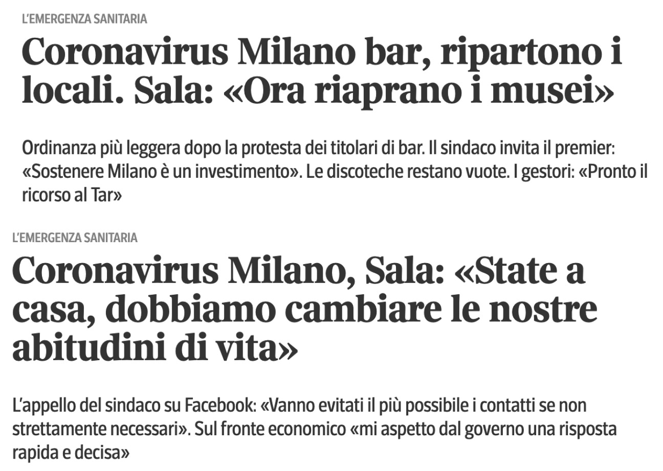 #milanononsiferma, #milanodoesntstop, Unternehmensvideo von Bürgermeister Sala, denn Mailand hört nicht auf: »Wir sind Millionen von Menschen. Wir tun jeden Tag große Dinge. Wir arbeiten jeden Tag hart. Wir erreichen jeden Tag das Unmögliche. Wir sind jeden Tag furchtlos. Wir können es schaffen. Wir werden nicht aufhören.«