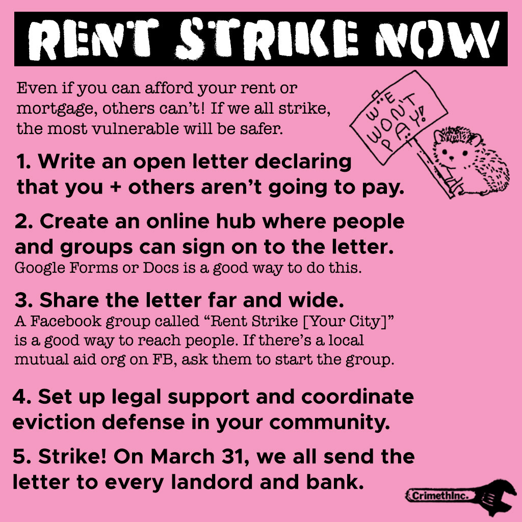 »Die Dringlichkeit des Momentes erfordert entschlossenes und kollektives Handeln. Wir tun dies, um uns selbst und unsere Gemeinschaft zu schützen und für sie zu sorgen. Mehr denn je lehnen wir Schulden ab, und wir weigern uns, uns ausbeuten zu lassen. Wir werden diese Last für die Kapitalist*innen nicht schultern. Vor fünf Jahren haben wir den Versuch unseres Vermieters, uns zu vertreiben, vereitelt. Wir gewannen dank der Solidarität unserer Nachbar*innen und unserer Freund*innen in der ganzen Welt. Wir appellieren erneut an dieses Netzwerk. Unser Kollektiv fühlt sich auf die Haus-Quarantäne vorbereitet, die um Mitternacht in der gesamten Bay Area beginnt. Der sinnvollste Akt der Solidarität ist für uns in diesem Moment, dass alle gemeinsam in den Streik treten. Wir werden euch den Rücken freihalten, so wie wir wissen, dass ihr uns den Rücken freihalten werdet. Ruht euch aus, betet, kümmert euch um einander.«