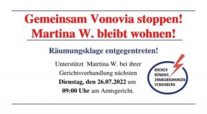 Unterstützt Martina W. bei ihrer Gerichtsverhandlung am 26.07.22 um 09.00 Uhr am Amtsgericht (Ostertorstraße 25 -31).