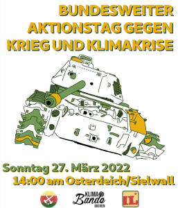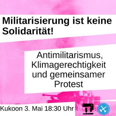 Von dort aus werden wir uns auf den Weg zum Rheinmetall-Büro am Osterdeich machen. Direkt vor der Haustür der Kriegsprofiteur:innen wird ein großes gemeinsames Straßenbild mit 100 Milliarden besseren Ideen als Aufrüstung entstehen.