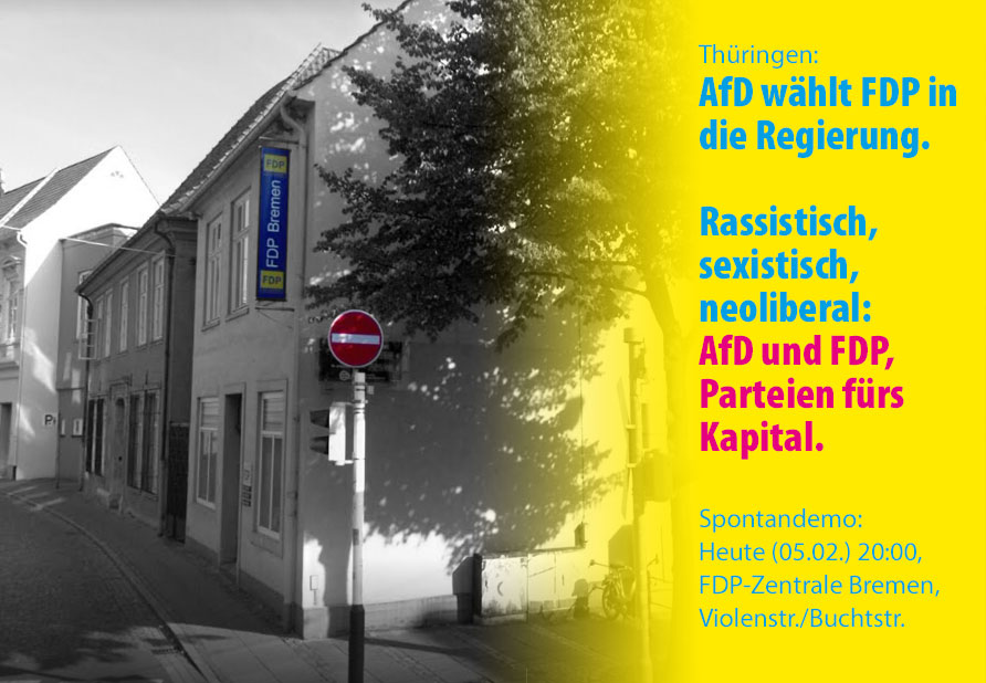 In Thüringen ist heute eine politische Bombe geplatzt: Die AfD hat den Kandidaten der FDP für den Ministerpräsidenten gewählt, der damit eine Mehrheit bekommen hat. Kemmerich (FDP) hat die Wahl angenommen. Damit droht die erste Koalition mit (stiller?) AfD-Beteiligung. In mehreren Städten sind spontane Demonstrationen angekündigt. Auch in Bremen wollen wir unsere Wut zeigen: Kommt heute (5.2.) um 20 Uhr vor die FDP-Zentrale an der Buchtstraße / Violenstraße (nähe Domsheide). Und teilt diesen
