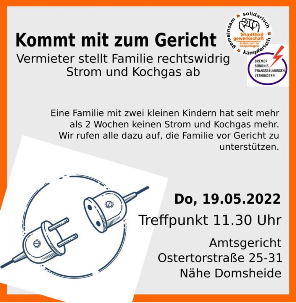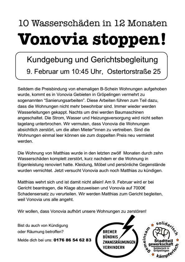 Die Stadtteilgewerkschaft Solidarisch in Gröpelingen und das Bündnis Zwangsräumungen verhindern unterstützen eine junge bulgarische Familie ihre Rechte gegenüber ihrem Vermieter durchzusetzen.