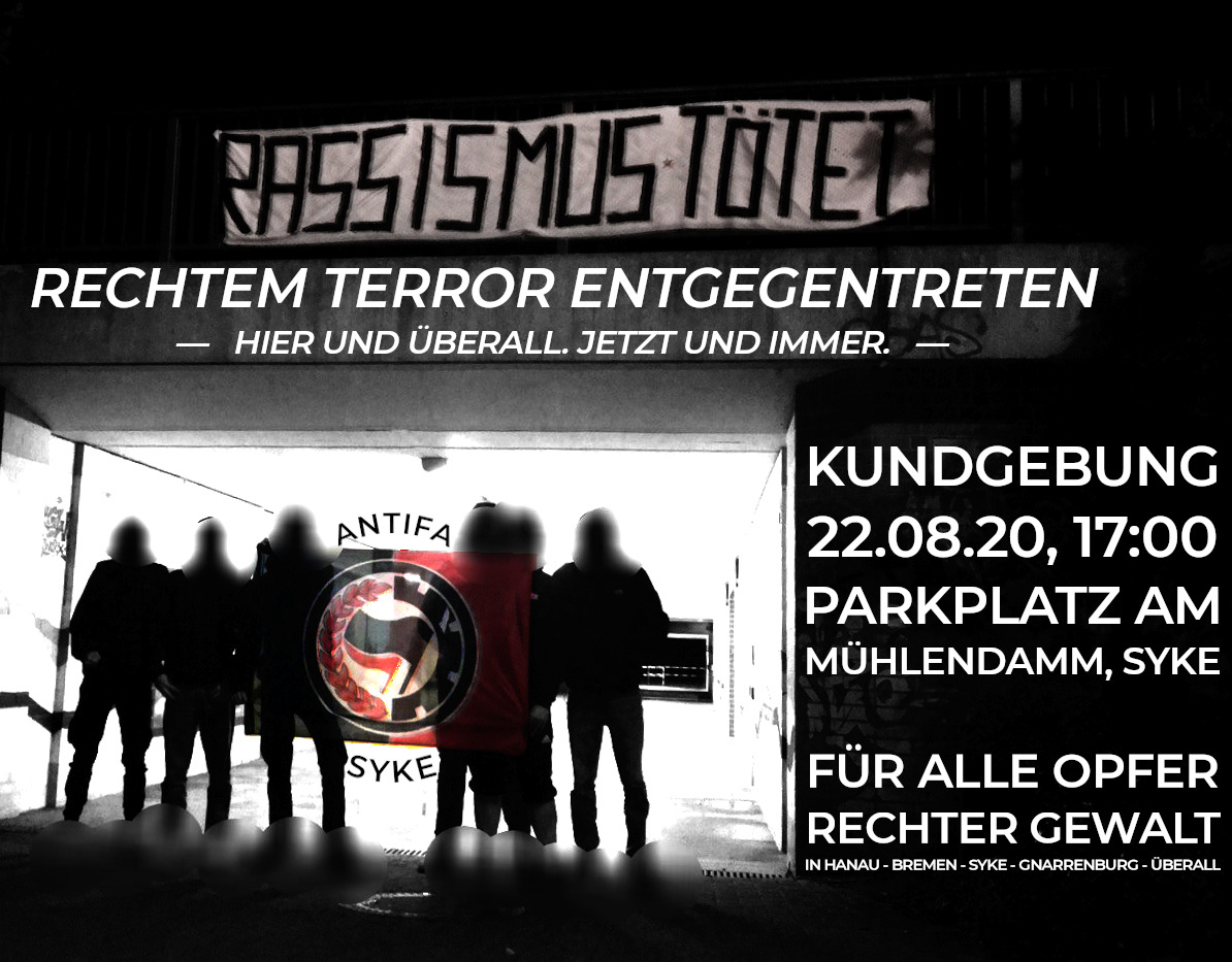 Exakt 6 Monate nach unserer Demo in Syke wird es erneut eine Kundgebung gegen rechten Terror in Syke geben.