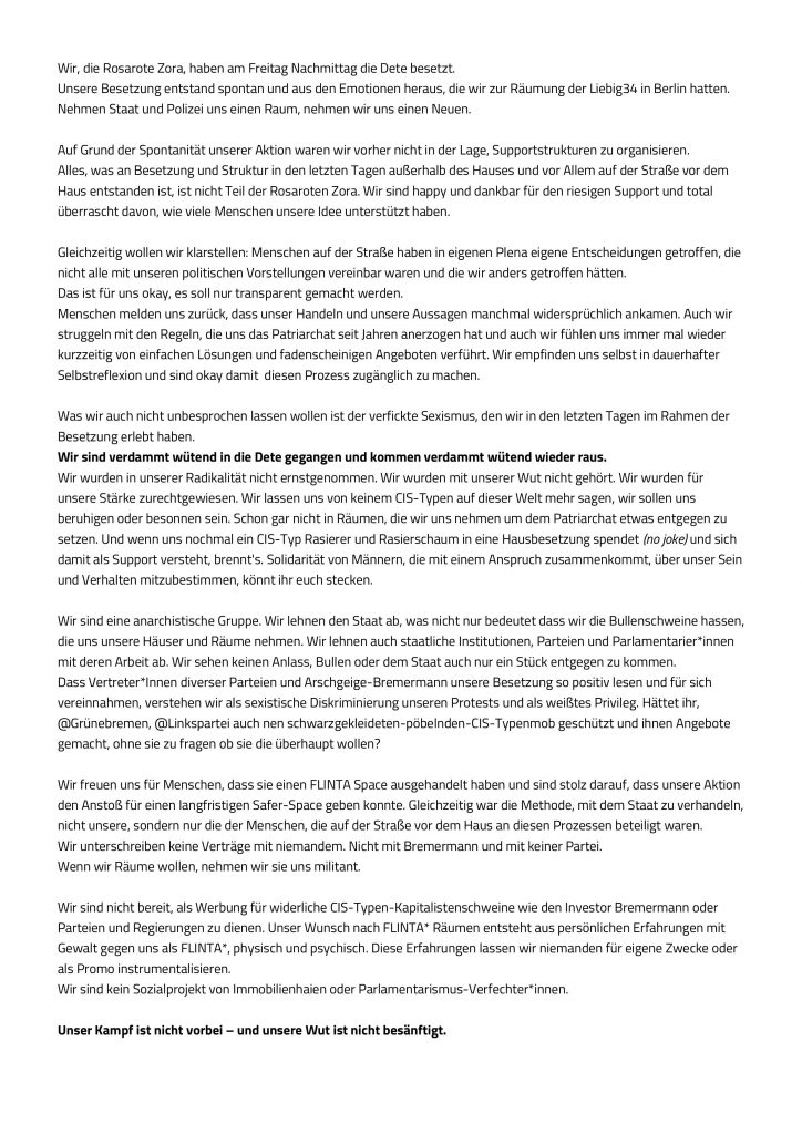 „Verdammt wütend in die Dete und verdammt wütend wieder raus.“ Posted on 19. Oktober 2020 by endofroad Ein Statement der anarchistischen, queerfeministische FLINTA*-Gruppe Rosarote Zora zur Besetzung der Dete