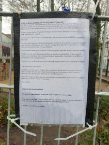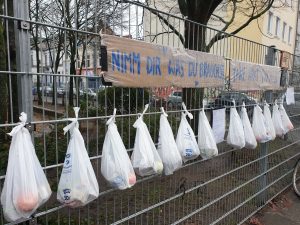 Solidarität muss mehr als ein symbolischer Akt sein. Deswegen, falls ihr es könnt, hängt sehr gerne frische Lebensmittel, Hygieneartikel, warme Kleidung, Spiele, Bücher und sonstige schönen Dinge an den Zaun.