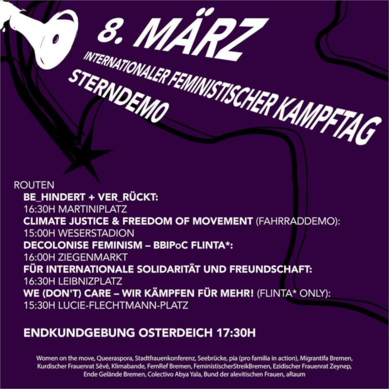 Am internationalen feministischen Kampftag protestieren wir für gerechte Pflege, gegen patriarchale Strukturen und rassistische Verhältnisse. Die Demo-Routen verlaufen zu Fuß und mit dem Rad durch die ganze Stadt und versammeln sich um 17:30 Uhr am Osterdeich für eine gemeinsame, groß angelegte Kundgebung. Wir sehen uns am 8. März!