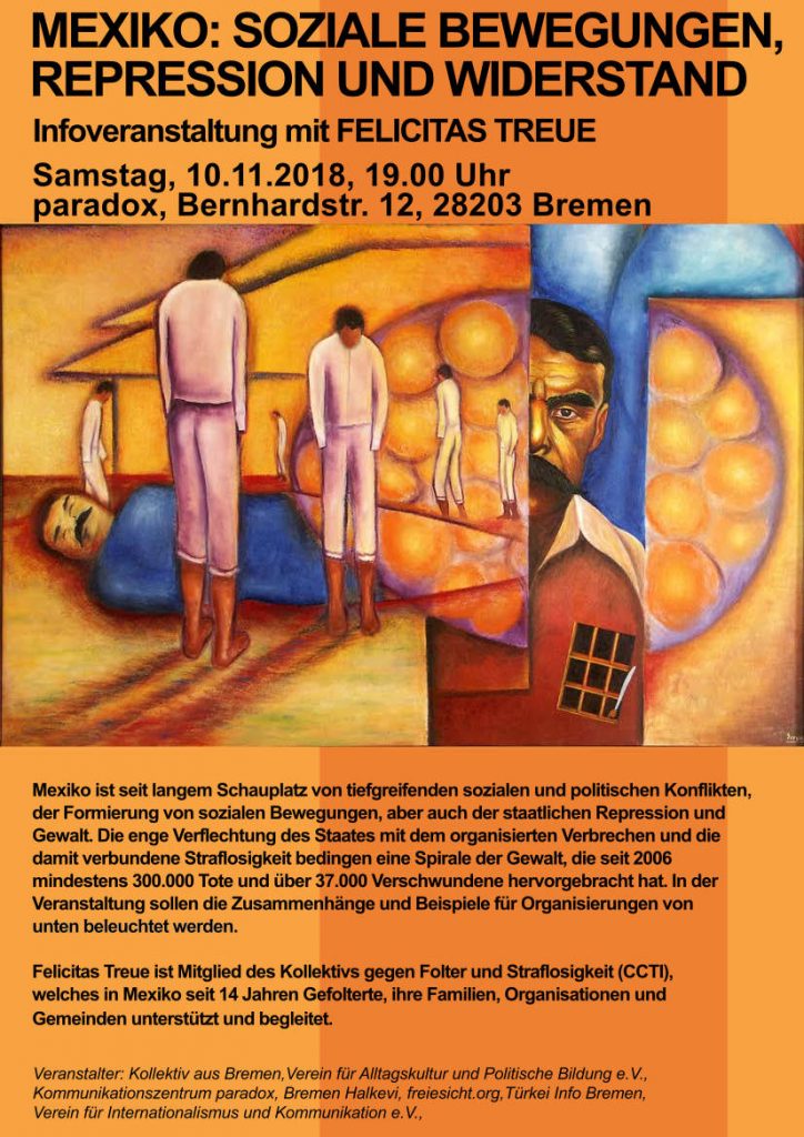 Mexiko ist seit langem Schauplatz von tiefgreifenden sozialen und politischen Konflikten, der Formierung von sozialen Bewegungen, aber auch der staatlichen Repression und Gewalt. Die enge Verflechtung des Staates mit dem organisierten Verbrechen und die damit verbundene Straflosigkeit bedingen eine Spirale der Gewalt, die seit 2006 mindestens 300.000 Tote und über 37.000 Verschwundene hervor gebracht hat. In der Veranstaltung sollen die Zusammenhänge aufgezeigt und Beispiele für Organisierungen von unten beleuchtet werden.