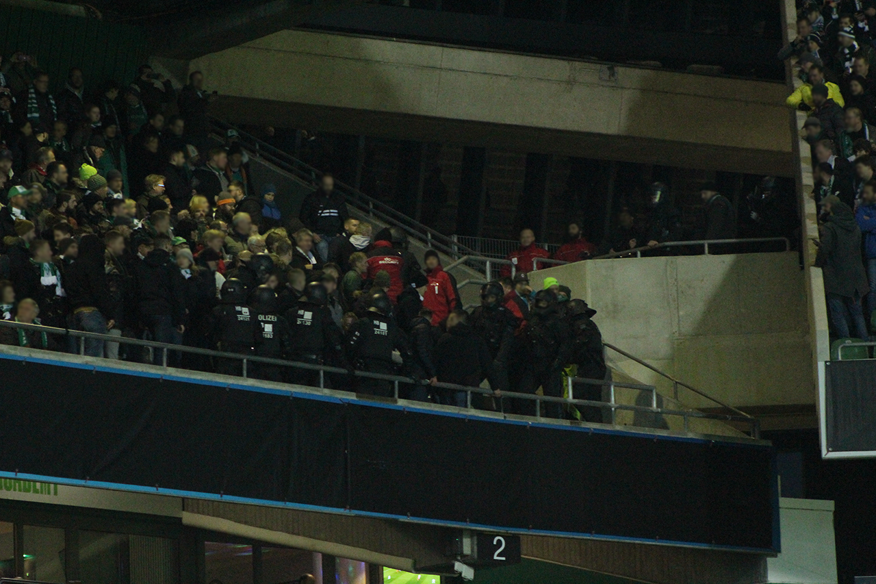 Aus Protest gegen den Polizeieinsatz verließen Teile der Ultras das Stadion. Andere Fans bejubelten ihren Abzug, was zeigt, dass durch die Werder-Fanszene ein Riss geht. Stadionsprecher Arnd Zeigler forderte die verbliebenen Bremer Anhänger in der Halbzeit auf, zu zeigen, wie gut sie Stimmung machen können. In der zweiten Hälfte schwappte dann die La-Ola-Welle immer wieder durch das Stadion.