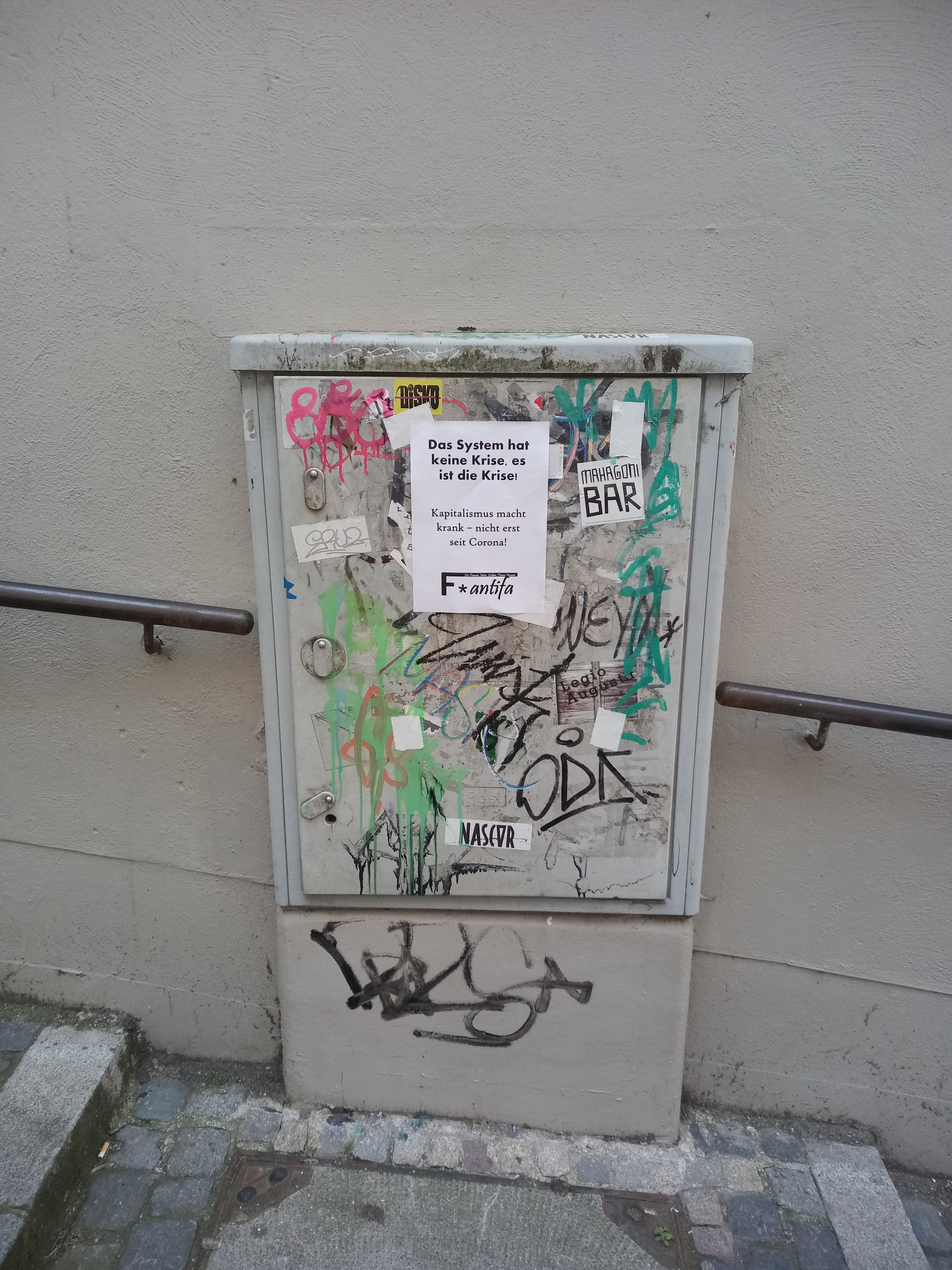 Wir haben uns gefragt: Welche politischen Aktionsformen sind möglich, welche sind unter Berücksichtigung der gesundheitlichen Risiken, aber auch der möglichen Repression sinnvoll? An diesem Wochenende waren Aktivist*innen der F*antifa Augsburg in Augsburg unterwegs, um gedruckte Zettel aufzuhängen, die sich mit der aktuellen Situation auseinandersetzen. Wir wollen so ein paar Leute zum Innehalten und Umdenken bewegen. Natürlich ist uns klar, dass das alles keine umfassende Systemkritik bietet und vieles auch zu kurz gefasst ist – das liegt aber in der Form des Mediums und der Darstellung.