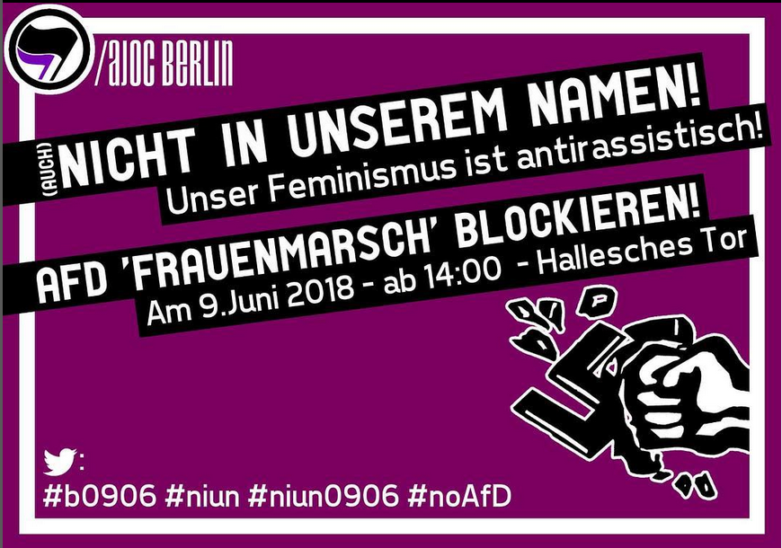 09.06.2018, Nicht in unserem Namen, Unser Feminismus ist antirassistisch, AfD „Frauenmarsch“ Blockieren!