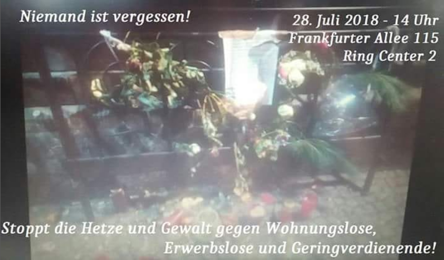 28.07.2018, Niemand ist Vergessen, Stoppt die Hetze und Gewalt gegen Wohnungslose, Erwerbslose und Geringverdienende!