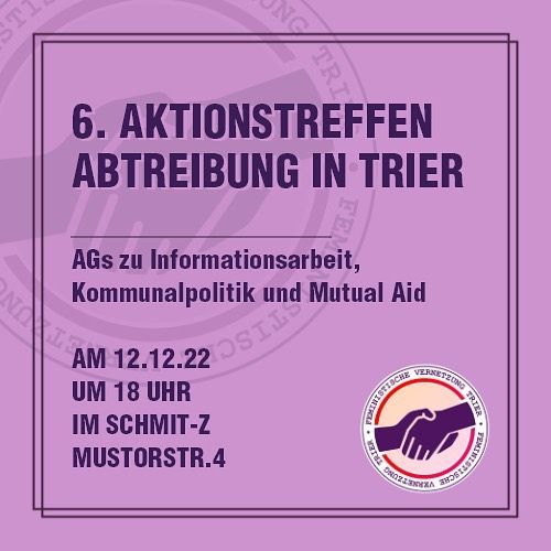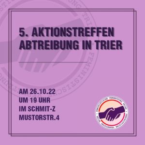 Es wird um Updates aus den Klein-AGs zu Infoflyern, Kommunalpolitik und Gegenseitige Unterstützung gehen. Wir organisieren gerade einen regelmäßigen Runden Tisch mit Trierer Beratungsstellen, der Frauenbeauftragten der Stadt, und Frauenärzt:innen, einen Online Vortrag zu reproduktiven Rechten, und einen Workshop zu Unterstützungsarbeit.