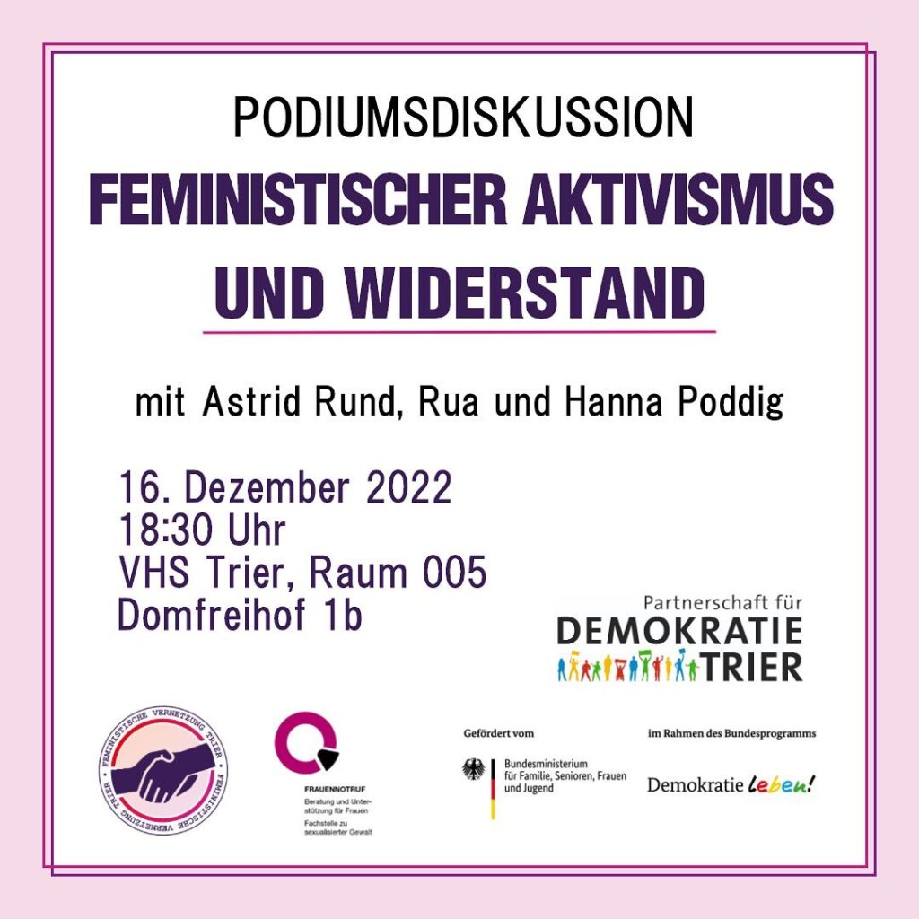 Die Podiumsdiskussion ist eine Veranstaltung von der Feministischen Vernetzung Trier und dem Frauennotruf Trier. Gefördert wird dieses Projekt im Rahmen der Partnerschaft für Demokratie, die Teil des Bundesprogrammes „Demokratie leben!“ des Bundesministeriums für Familie, Senioren, Frauen und Jugend ist.