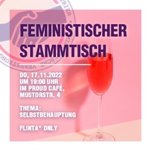 Bei unserem FLINTA*-only Stammtisch am 17. November um 19 Uhr im Proud (Mustorstraße 4) geht es um Selbstbehauptung. Wir wollen voneinander lernen und uns gegenseitig stärken. Es sind keine Vorkenntnisse nötig. Es geht um Austausch von Erfahrungen und woraus wir Kraft ziehen. Bitte kommt getestet und symptomfrei. Wir freuen uns auf euch!