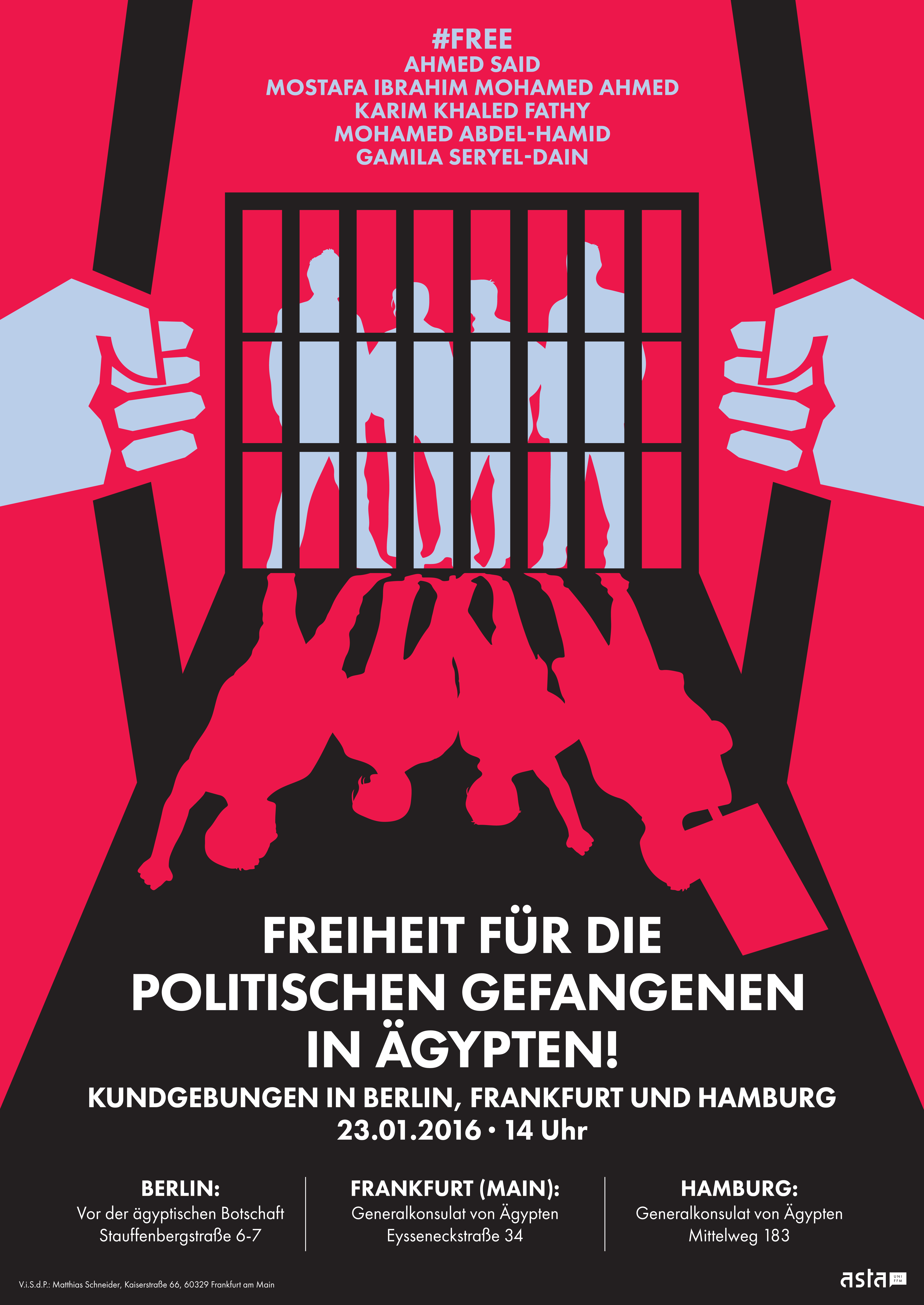 Der vom ägyptischen Recht zugrunde gelegte Terrorismusbegriff ist dabei so weit gefasst ist, dass schlechterdings jegliche Opposition gegen das Regime Gefahr läuft, durch das Terrorismusgesetz illegalisiert zu werden. Vielleicht kann uns das BKA ja eine solide Erklärung liefern, inwiefern ein dichtender Arzt mit seinen Freund*innen und Pappschildern auf einem Gehweg Terrorist ist. Wir sind gespannt auf die Antwort.