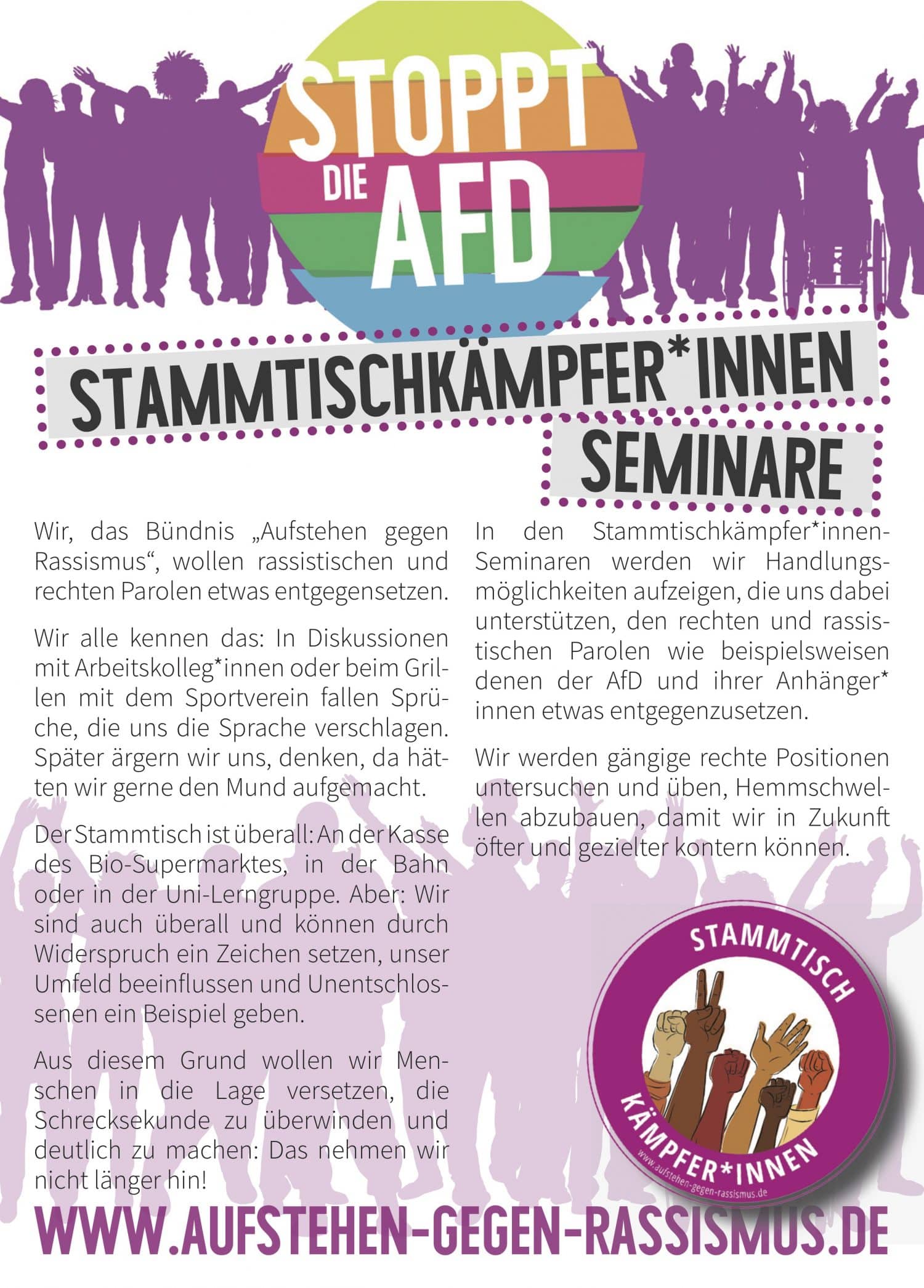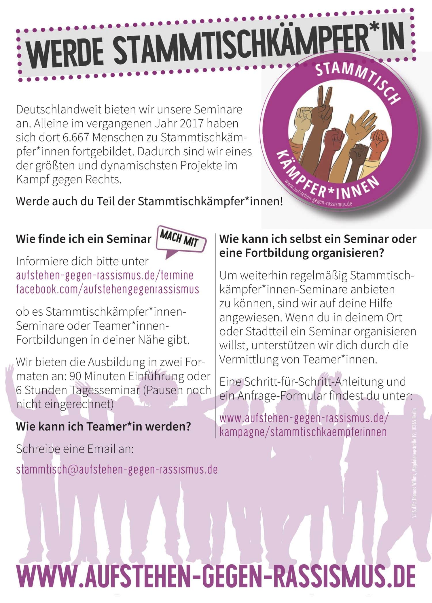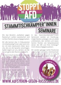 Als Projekt des Bündnisses „Aufstehen gegen Rechts“ geben die Stammtischkämper*innen regelmäßig im ganzen Bundesgebiet Workshops. Diese sollen dazu ermutigen, rassistischen und rechten Parolen etwas entgegenzusetzen. Dieser Workshop wird sich damit beschäftigen, den Teilnehmenden Strategien an die Hand zu geben, auch mit alltäglichem Sexismus umzugehen.