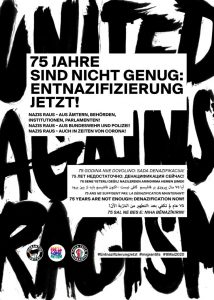 Link Aufruf Welcome United 75 Jahre sind nicht genug – Entnazifizierung jetzt! #migrantifa #entnazifizierungjetzt #8Mai2020 Nazis raus – aus Ämtern, Behörden, Institutionen, Parlamenten! Nazis raus – aus Bundeswehr und Polizei! Nazis raus – auch in Zeiten von Corona!