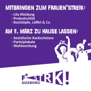Das Frauen*Streikkomitee Augsburg ruft am 1. Mai zum Streik auf – denn 8. März ist jeden Tag! Frauen* und Queers, bestreikt die Haushalte, die Sorgetätigkeit in euren Familien und Haushalten und die emotionale Sorgearbeit! Wir alle sind Arbeiter*innen und auch an einem Feiertag im Einsatz. Deshalb machen wir den 1. Mai, den Tag der Arbeit, zu unserem Streiktag!