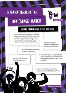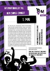 Vor beinahe 2 Monaten haben wir gemeinsam am 8. März zum internationalen Frauenkampftag in Form des Frauen*streiks demonstriert, unseren Kampf in die Öffentlichkeit getragen und uns politisiert. Jetzt nutzen wir den Tag der Arbeit, um unsere gesellschaftstragende Arbeit sichtbar zu machen, indem wir sie kreativ bestreiken.