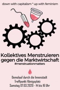 For the first time, the traditional KMM is making its way through the city centre. Wombs have been menstruating for a long time. Capitalism has not yet raged for so long. At least not as long as wombs. Collectively we have been before, then again not so much, then again, then again not so much. And we certainly are now. In any case, it’s somehow time to finally bring it all together: In the spirit of “menstrual blood before capitalist shit” we put the market economy back in its place!
