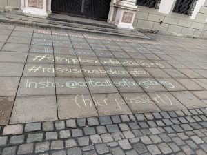 Die Catcallsofaugsburg ließen die Aktion der Polizei jedenfalls nicht unkommentiert stehen und starteten in Kooperation mit mehreren feministischen, antirastisstischen und queeren Bewegungen in Augsburg eine groß angelegte Sternmarsch-Kreideaktion, um auf diese Missstände aufmerksam zu machen. #wewontbesilenced
