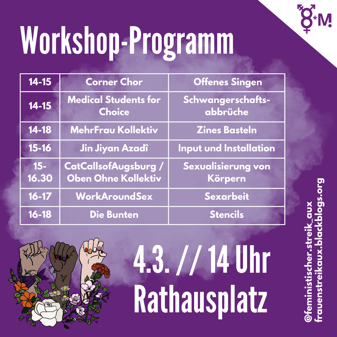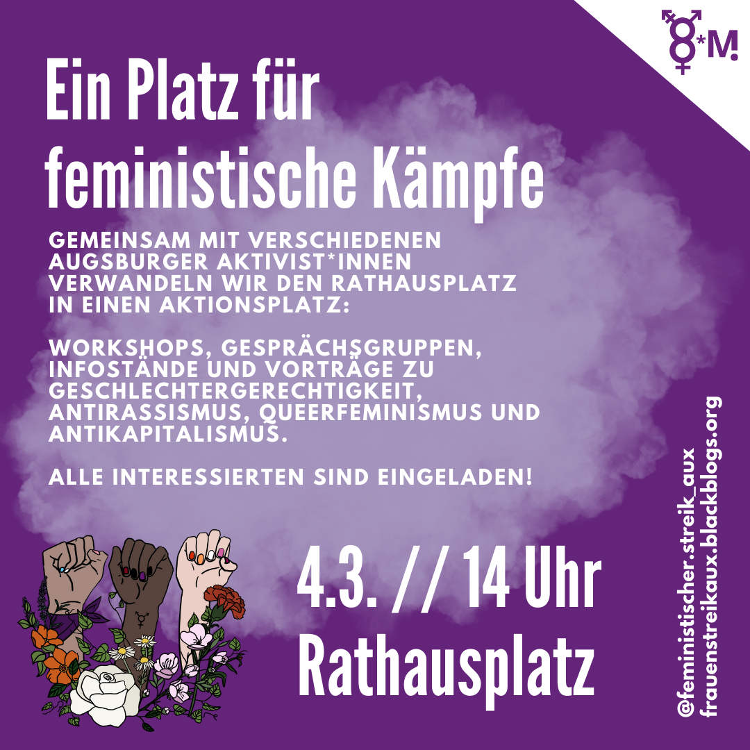 Gemeinsam mit verschiedenen Augsburger Aktivist*innen verwandeln wir den Rathausplatz in einen Aktionsplatz: In Workshops und Gesprächsgruppen, an Infoständen und bei Vorträgen kommen wir mit interessierten Passant*innen ins Gespräch. Dabei geht es um Geschlechtergerechtigkeit, Antirassismus, Queerfeminismus und Antikapitalismus.