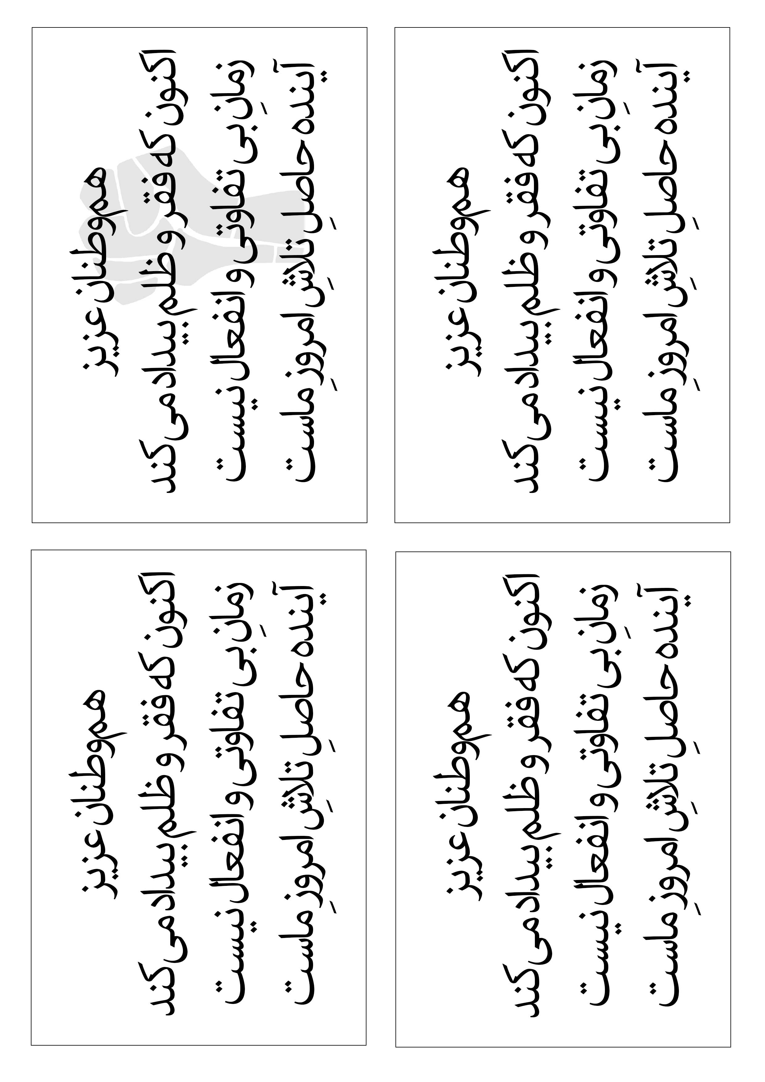 شما میتوانید با چاپ برگهٔ زیر بر روی تعدادی کاغذ آ-چهار و برش دادن آن ؛ از هر برگ کاغذ، تعداد ۴ اعلامیه کوچک تولید کنید.