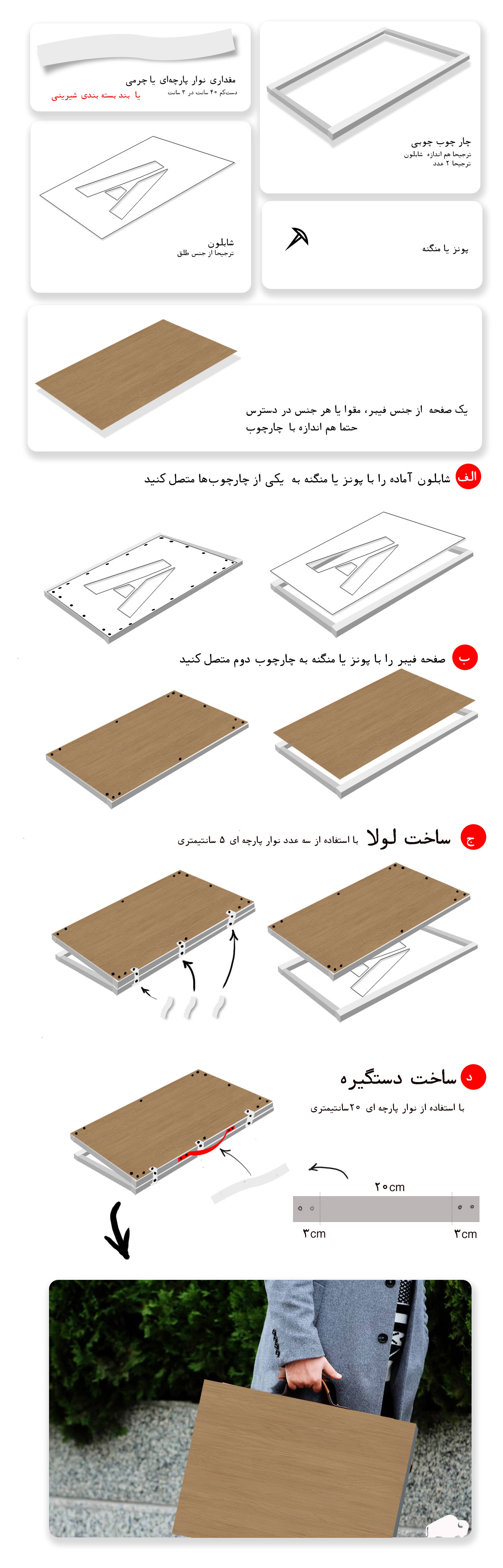 سپس با لولا یا با استفاده از چند تکه پاچه یا چرم مستحکم، آن دو را مثل یک کیف سامسونت از یک طرف به هم متصل کرده و با اضافی کردن یک دستگیره، امکان حمل و نقل و استفاده سریع تر و طولانی تر از شابلون را فراهم میآوریم.