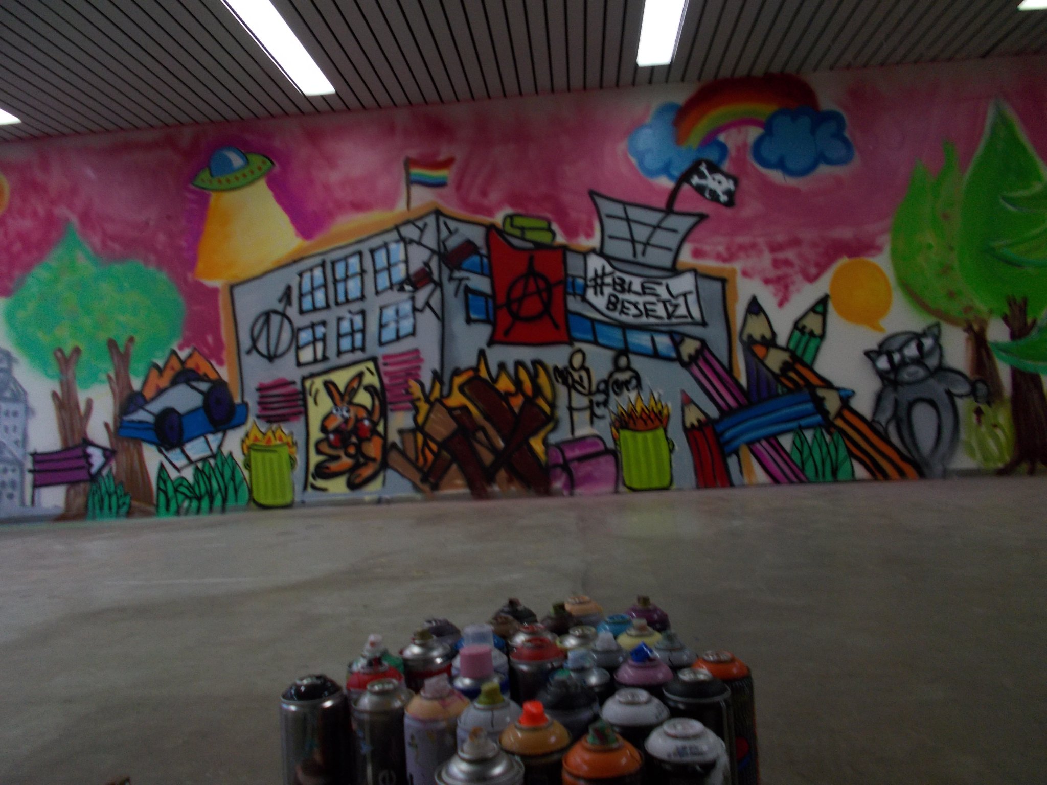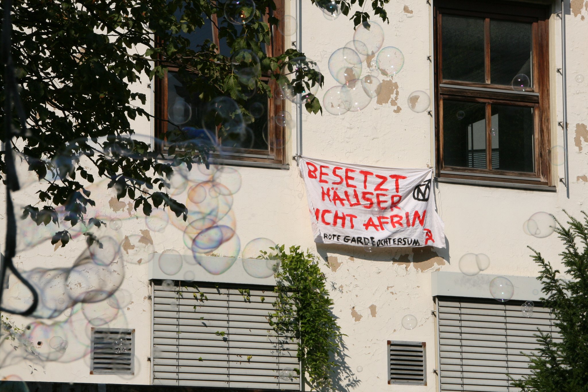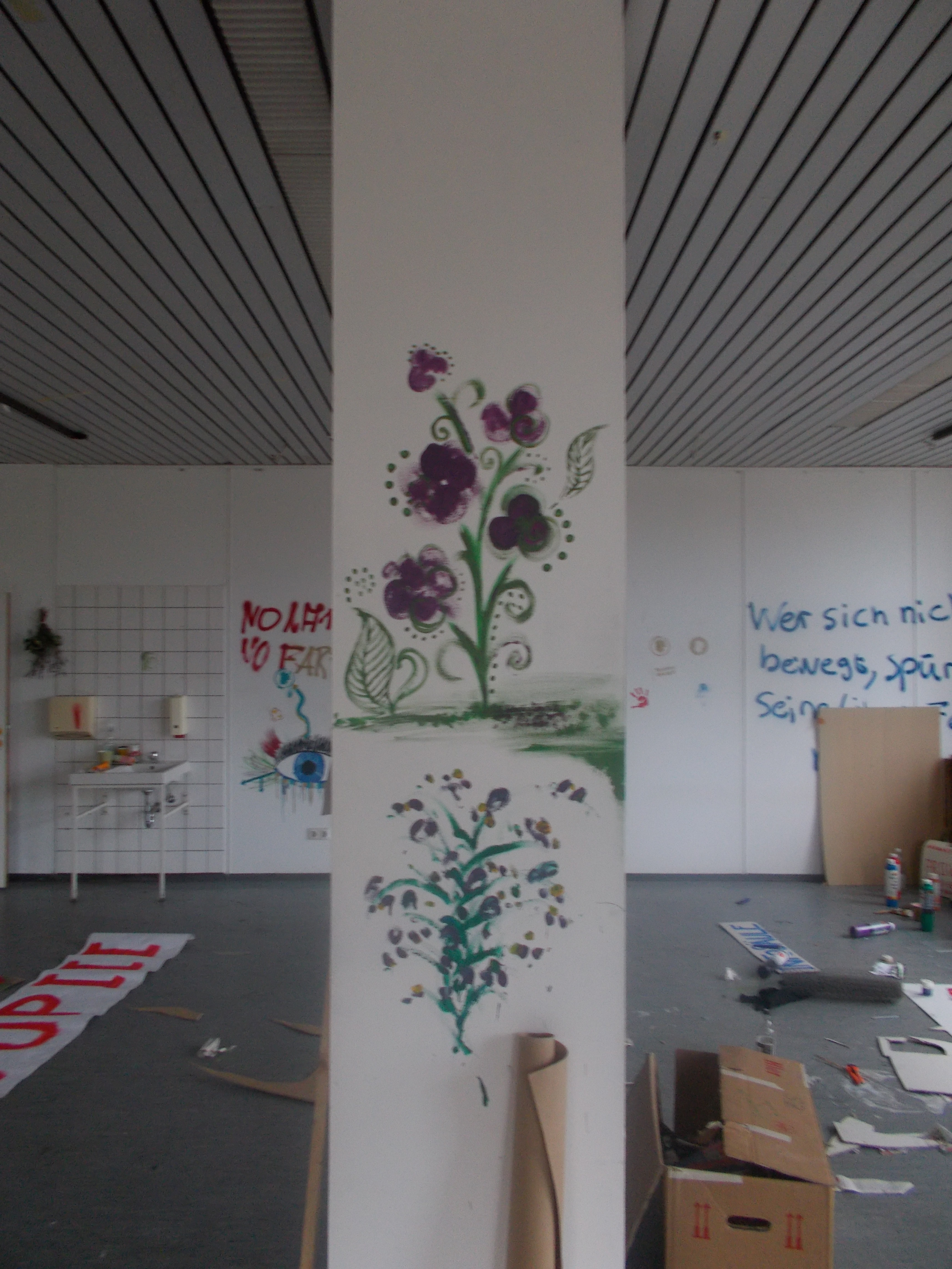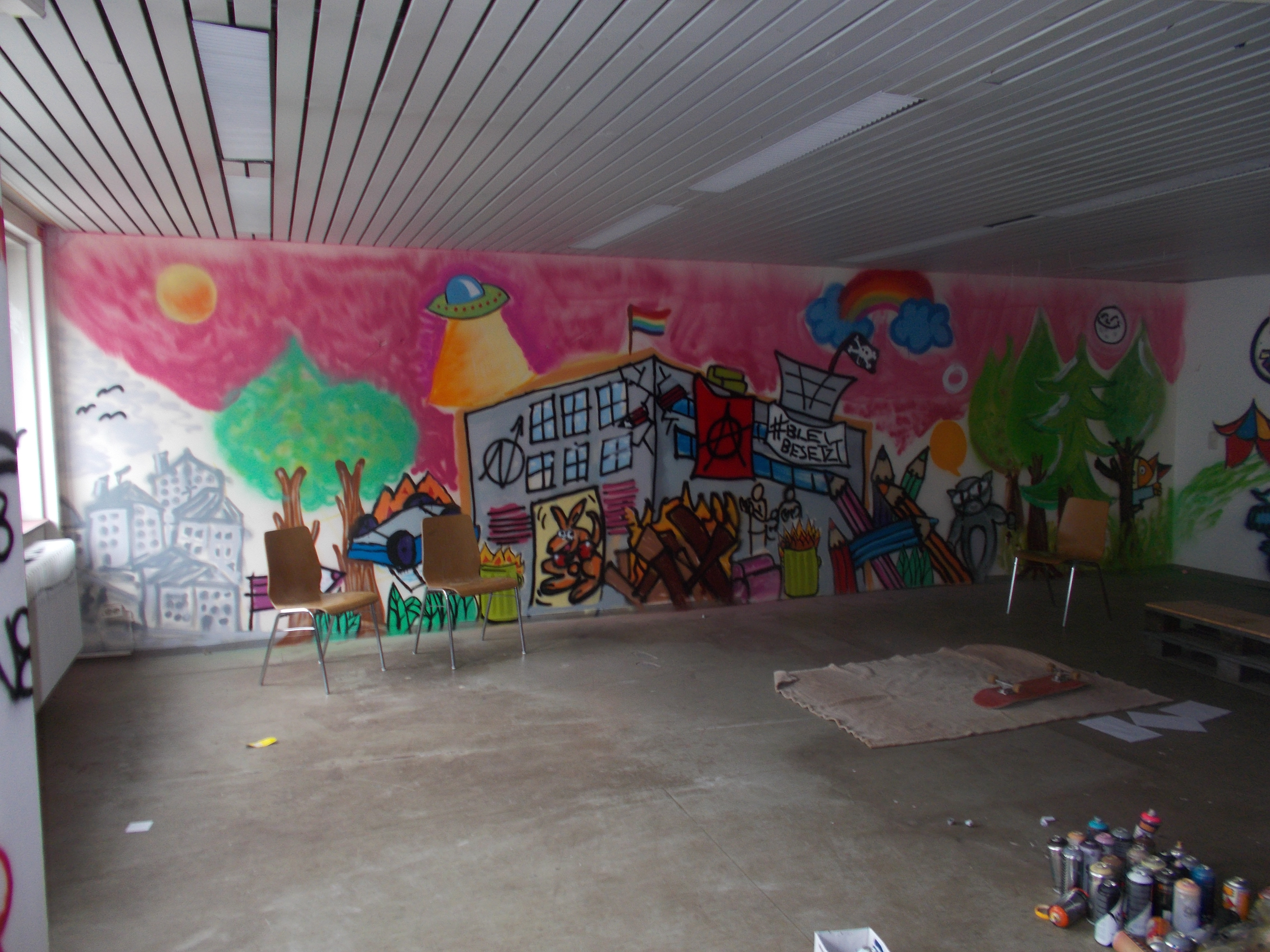 Am Wochenende haben die Besetzenden wieder in ihr Zentrum eingeladen. Es gab ein buntes Programm: Pappmaschee- und Tätowierworkshops, Filmvorführungen, politische Diskussionsveranstaltungen und musikalisch-künstlerische Darbietungen. Es war für alle etwas dabei.