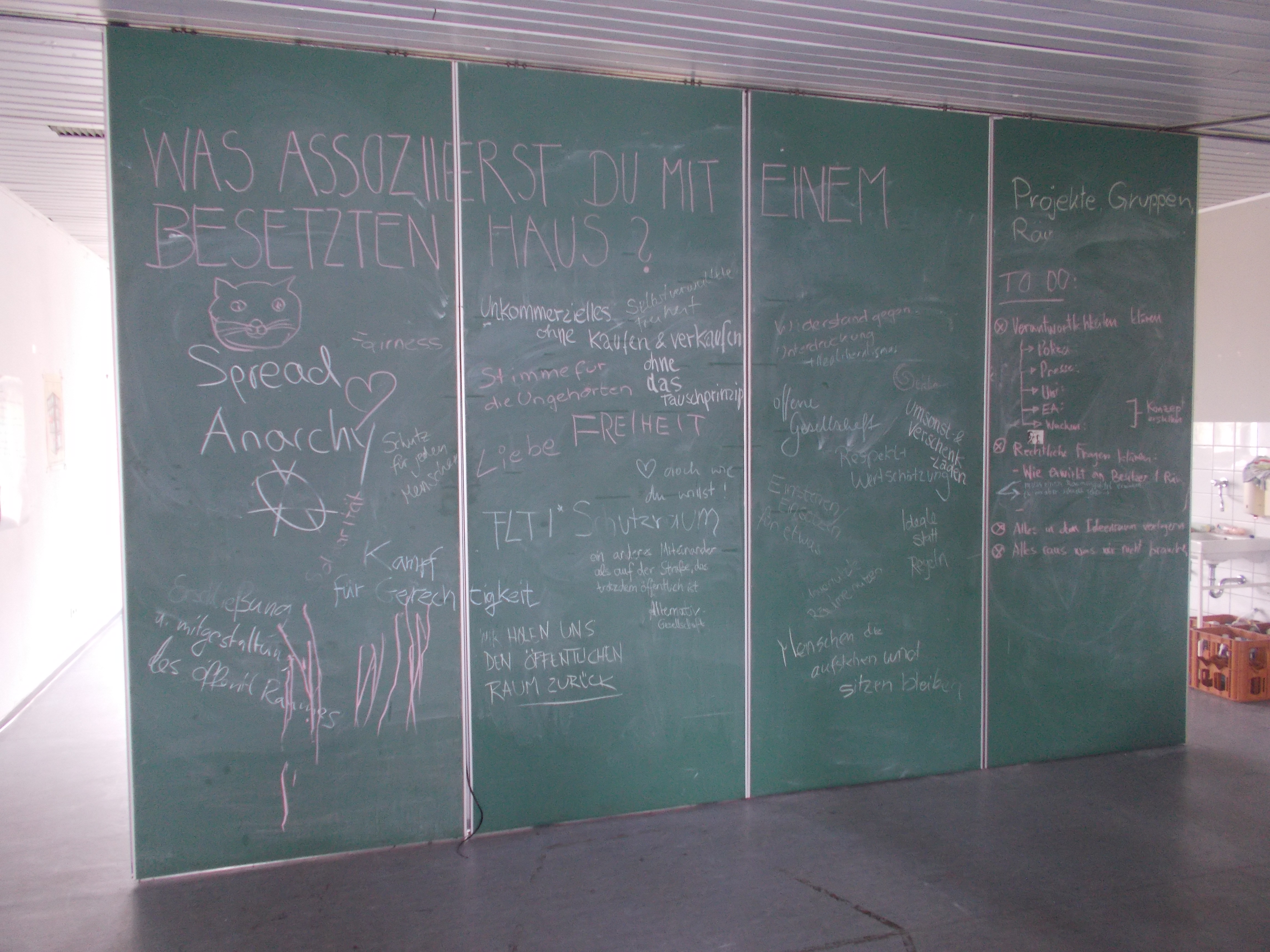 Neu ankommende Menschen werden freundlich begrüßt in diesem Haus. Wenn nicht gerade alle beim Essen sind, gibt es immer die Möglichkeit durch das Haus geführt zu werden. Fast immer gibt es frischen Kaffee und es herrscht ein kreatives Gewusel in den Räumlichkeiten: In einem Raum werden Schilder bemalt und Informationsplakate gestaltet, während nebenan ein paar Leute zusammen Musik machen und irgendwo sitzen immer Menschen unterhalten sich angeregt oder diskutieren.