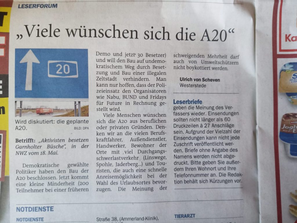 Gestern war folgender Leser*innenbrief über unsere Besetzung in der lokalen Zeitung, der Nord-West Zeitung (NWZ):