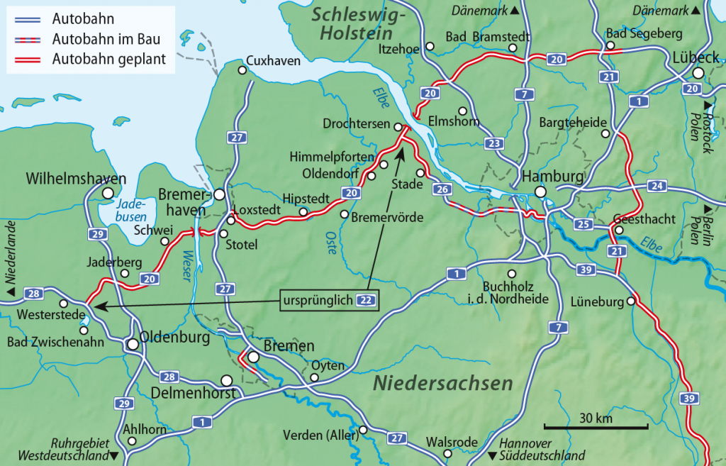 The A20, which currently runs from Uckermark in Brandenburg to Bad Segeberg in Schleswig-Holstein, is to be extended by more than 200 kilometers to Westerstede behind Oldenburg in western Lower Saxony. The extension is divided into more than 20 planning sections, is to cost over 5 billion euros, will have the longest underwater tunnel in Germany (Elbe crossing; >5 km) and is planned to be be completed by 2030.