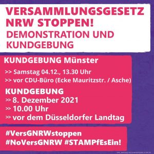 Bereits am 8.12. will die NRW-Landesregierung ihr restriktives Versammlungsgesetz durch den Innenausschuss bringen und eine Woche später im Landtag verabschieden. Nach Monaten des Stillstands aufgrund der starken Proteste soll es nun zack-zack gehen. Es ist bis jetzt nicht bekannt, welche Änderungen die Landesregierung noch einbringen will. Wir befürchten nichts Gutes. Deshalb gibt es am 4.12. und 8.12. dezentrale Proteste in NRW: https://www.nrw-versammlungsgesetz-stoppen.de/aktionen/