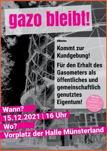 die Zukunft des Münsteraner Gasometers steht auf dem Spiel. Die Vermieter:innen – die Stadtwerke Münster – verlängern unseren Nutzungsvertrag nicht und wir sollen das Gelände auf den 1.1.2022 verlassen. Für die Stadtwerke ist das Gasometergelände eine unwirtschaftliche Altlast, die die Stadtwerke möglichst rentabel loswerden wollen, um als öffentliches Unternehmen ihrer Verantwortung einer soliden Wirtschaftlichkeit nachzukommen. Aber der geplante Verkauf des Geländes heißt auch: Wieder einmal muss ein Wahrzeichen der Stadt, ein selbstverwalteter bzw. kulturell genutzter Ort einem Investorenwettbewerb weichen. Wieder einmal soll öffentliches Eigentum an Privatinvestor:innen verkauft werden. So gestalten private Profitinteressen unsere Stadt und nicht der Bedarf der Bürger*innen. Doch der Gasometer gehört (noch) uns allen!