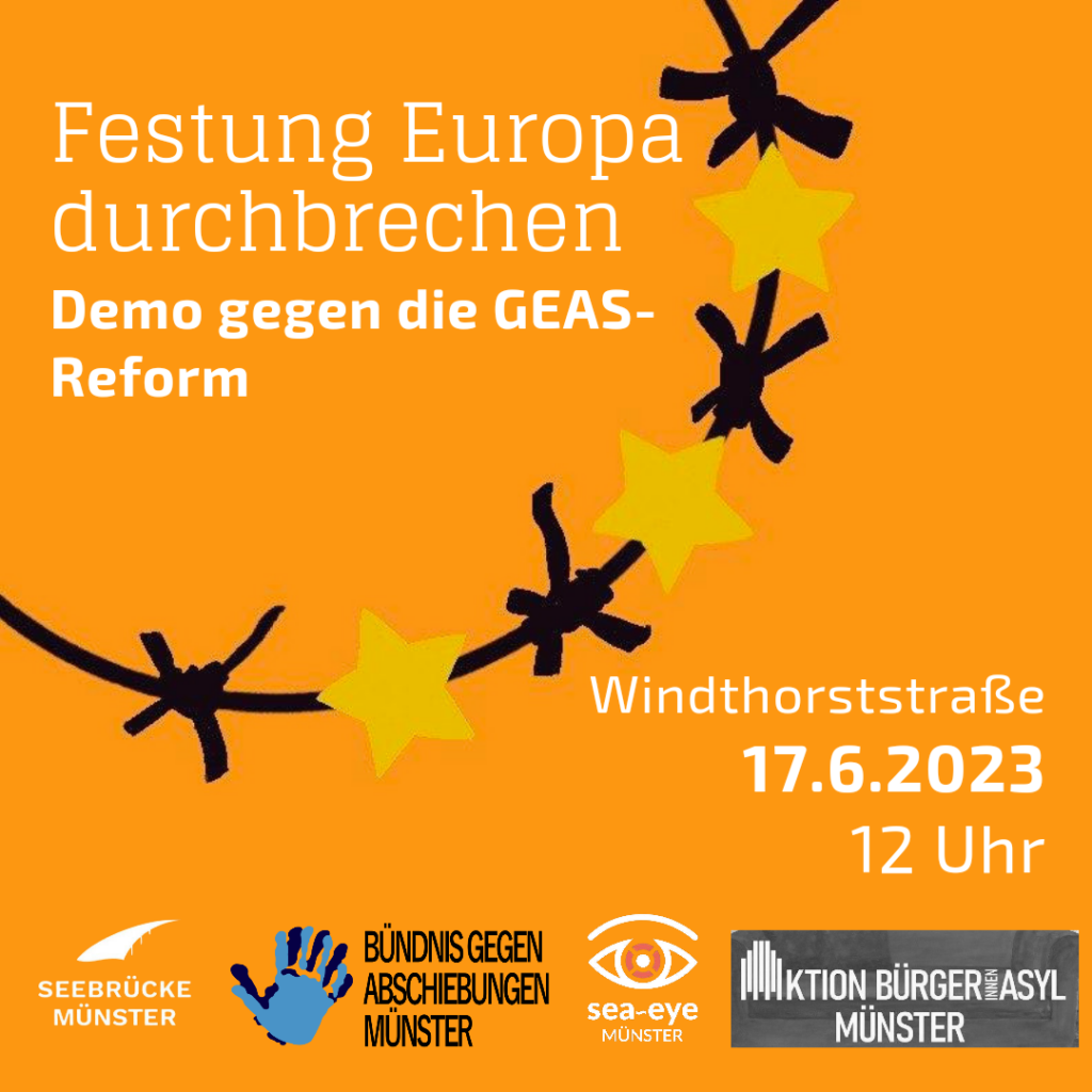 Am kommenden Samstag, den 17.06., rufen die Seebrücke Münster, die Lokalgruppe Sea-Eye Münster, das Bündnis gegen Abschiebungen und die Aktion Bürger*innenasyl Münster zu einer Demonstration gegen die geplante Reform des europäischen Asylrechts auf. Start ist um 12 Uhr in der Windthorststraße am Hauptbahnhof Münster.