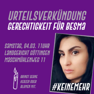 Im April 2020 wurde Besma A. von ihrem Ehemann in Einbeck durch einen Kopfschuss in ihrem Wohnzimmer getötet. Seit 2 Jahren läuft der Prozess gegen den Täter am Landgericht in Göttingen. Letzte Woche hat die Strafverteidigung nach einem Jahr der Verzögerung des Prozessendes durch immer weitere, zermürbende Beweisanträge auf Freispruch plädiert, kommenden Samstag, am 04.03. wird das Urteil im Prozess verkündet. Wir denken jedoch, dass Besma Opfer eines Femizids wurde.