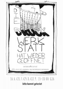 Die Siebdruckwerkstatt hat wieder geöffnet. Besucht uns am 21.4. oder am 19.5. oder am 16.6. von 15-18:00.