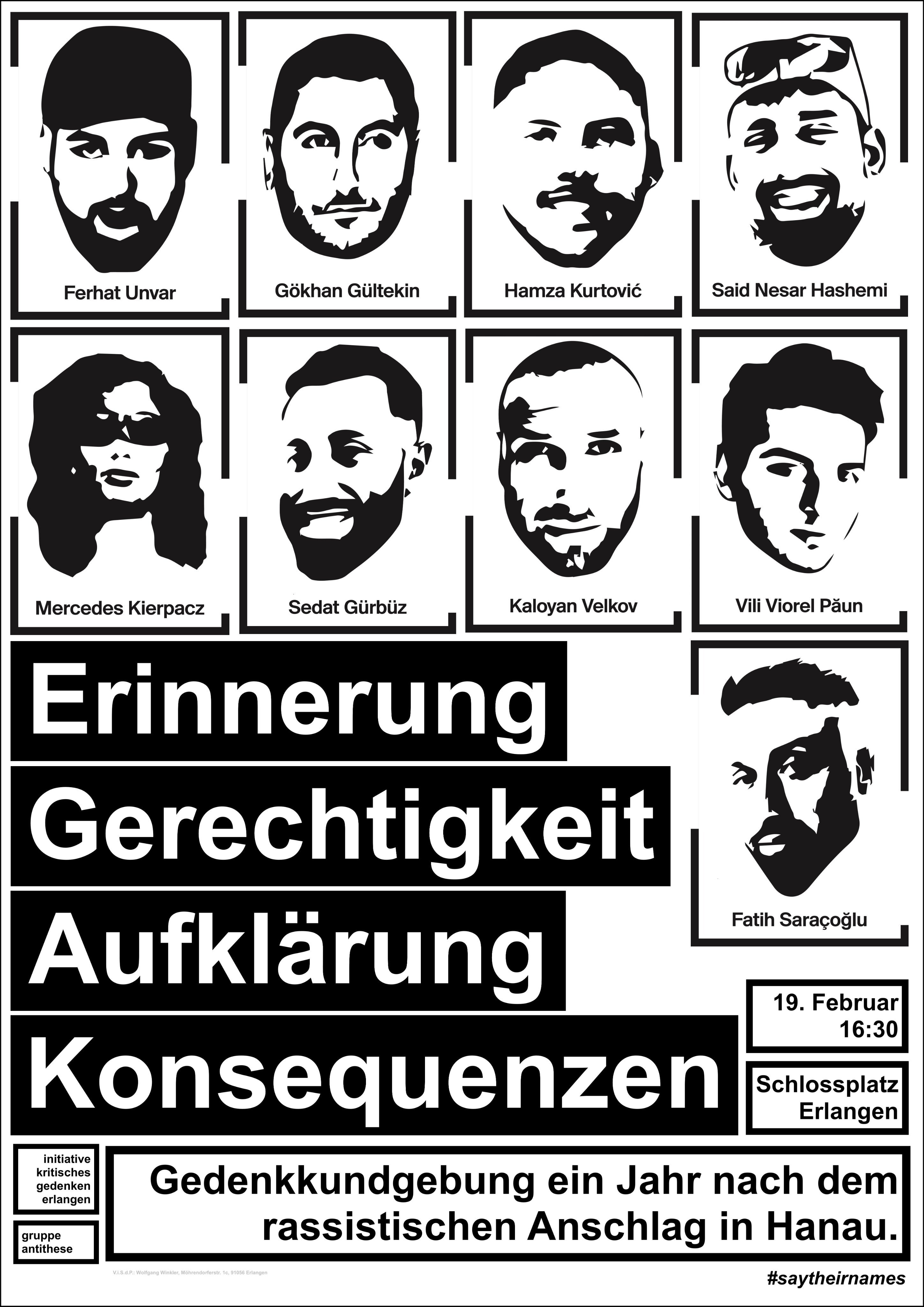 Die Gruppe Antithese und die initiative kritisches gedenken organisieren eine Kundgebung im Gedenken an Ferhat Unvar, Hamza Kurtović, Said Nesar Hashemi, Vili Viorel Păun, Mercedes Kierpacz, Kaloyan Velkov, Fatih Saraçoğlu, Sedat Gürbüz und Gökhan Gültekin.