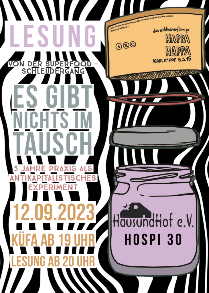 Wie kaum zu übersehen ist, spitzen sich hierzulande Wirtschaftskrise und soziale Konflikte zu. Höchste Zeit, sich über solidarische Alternativen zum Kapitalismus Gedanken zu machen. Deswegen waren wir nicht nur in der Verarbeitungsküche emsig. Am Karla*hof in der Uckermark erproben wir als Kollektiv unkapitalistische Wirtschaftsweisen. Nun ist unsere Reflexionsbroschüre „Es gibt nichts im Tausch“ fertig und wir wollen mit euch darüber diskutieren, wie wir jetzt und hier eine zukunftsfähige Wirtschaft und Grundversorgung entwickeln können. Wir berichten aus 5 Jahren Produktions-Praxis ohne direkten Tausch, geben einen kleinen Einblick in unsere Erkenntnisse, Schwierigkeiten und erzählen, wie wir uns vorstellen, ein größeres Netzwerk von nicht-kommerziellen Produktionsgruppen aufzubauen. Auf unserer kleinen Lesereise wollen wir mit euch und anderen in Kontakt kommen, um gemeinsam Wege aus dem Kapitalismus zu ergründen.