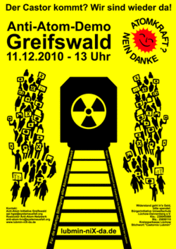 Liebe FreundInnen, in Greifswald demonstrierten nach Angaben der örtlichen Initiativen am Samstag bei nasskaltem Sprühregen 3600 Menschen gegen den Castor-Transport von Südfrankreich ins Zwischenlager Lubmin – das ist ein toller Erfolg für die monatelange harte Arbeit vor Ort! Wir hoffen, dass nächste Woche viele Leute an die Ostsee fahren und dort mithelfen, gegen diese neue Castor-Fuhre zu protestieren. Auch in Freiburg fand am Samstag aus Anlass des dt.-franz. Gipfels eine Anti-Atom-Demo statt. Aktuelle Infos auf www.lubmin-nixda.de und www.contratom.de. Am Sonntag geht es im Münsterland in Ahaus weiter.
