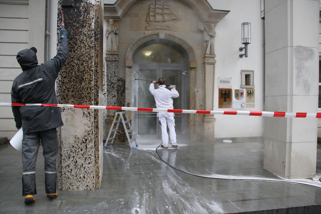 Kurz nach 22 Uhr sprühten offenbar einige der Demonstranten schwarze Farbe großflächig gegen die Eingangstür und umliegende Wandbereiche der Oberfinanzdirektion. Der Zentrale Kriminaldienst sicherte Spuren am Tatort und die Kriminalpolizei nahm die Ermittlungen auf.