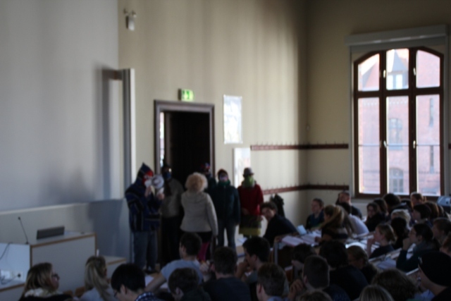 Wer bisher immer dachte Einführungsveranstaltungen in das Fachgebiet der Politikwissenschaft seien eher dröge Vorlesungen, die man über sich ergehen lassen muss, um dann in die richtigen Veranstaltungen zu kommen, wurde heute eines besseren belehrt. Denn im Hörsaal 05 wurde vorgeführt, wie Politik auch sein kann. Und so haben die Studierenden auch heute etwas gelernt. Nota bene: Zwei Dutzend Kostümierte + Konfetti + Flyer + „Nazi“-Schilder + ein eingeschnappter Nazikader = geouteter Nazi.