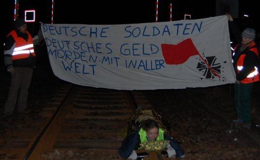 Als Einstieg in den Vortrag zeigten die VeranstalterInnen einen kurzen Film, der Originalaufnahmen vom 11.2.2008 zeigt. Damals versuchten Angehörige des Materialdepots Ohrstedt (Schleswig-Holstein) einen mit Militärgerät beladenen Zug für Bundeswehreinheiten bei der Nato-Response-Force zu einem Manöver nach Jägerbrück in Brandenburg zu verlegen. Sie kamen jedoch lediglich wenige Kilometer, da beim Übergang zum Hauptgleis eine Protestkundgebung auf den Zug wartete. Um ihren Protest zu verdeutlichen, hatte sich zudem eine Aktivistin ans Gleis gekettet. ( Link zum Film und der Pressemitteilung zur Aktion: http://husuma.nirgendwo.info/2008/02/21/militartransport-blockiert/#more-666 ). Des weiteren zeigte der Film spektakuläre Bilder der anschließenden Räumung.