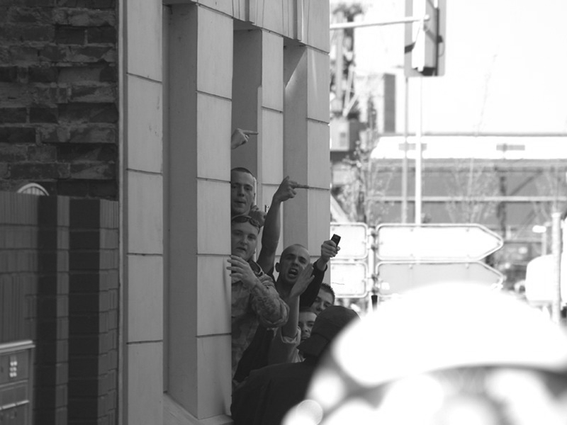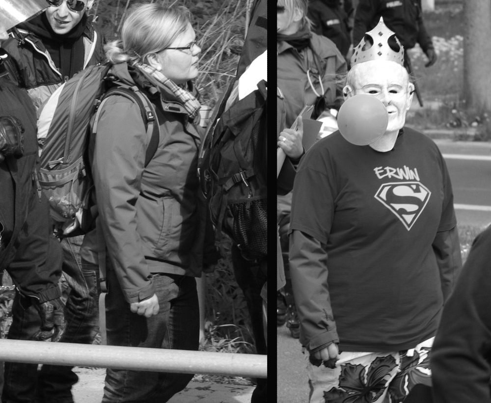 2007: Während ein Teil der BesucherInnen aus der Wolfshöhle II unten gegen die Antifa-Demo pöbeln, wird von oben mit „Zwillen“ geschossen