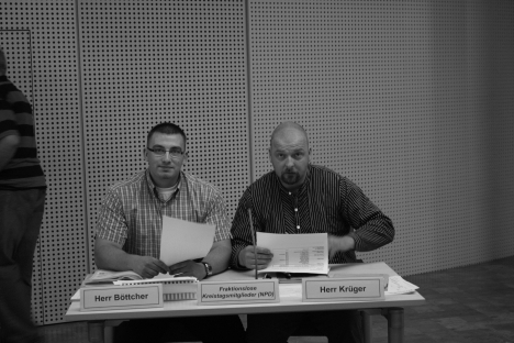 Erst im Jahr 2007 versuchte die Landespolitik eher hilflos, auf die Situation im Ort zu reagieren. Der Innenausschuss des Landtages traf sich pressewirksam zur Sitzung in Jamel, doch geändert hat das wenig an der Situation im Dorf, in dem mittlerweile fast nur noch Neonazis lebten. Aus dem Skinhead Krüger war zwischenzeitlich ein Unternehmer geworden, der bei seinem Abrissunternehmen vor allem Neonazis einstellte – “Jungs für`s Grobe” eben. Doch auch politisch blieb der mehrfach vorbestrafte und inhaftierte Krüger aktiv, seit 2006 immer stärker für die NPD. Er organisierte federführend deren Landtagswahlkampf in Nordwestmecklenburg und Wismar und trat 2009 für die Partei erfolgreich zur Kommunalwahl an. Gemeinsam mit dem damals ebenfalls in der Region lebenden David Böttcher vertrat er die NPD fortan im Kreistag Nordwestmecklenburg. Dieses Engagement wurde schließlich belohnt und Krüger in den Landesvorstand der Partei gewählt. Ebenfalls im Jahr 2009 erwarb er ein ehemaliges Betonwerk im Grevesmühlener Industriegebiet. Nach umfangreichen Umbaumaßnahmen wurde dieses Gebäude im April 2010 als “Thinghaus” eröffnet. Ein zwei Meter hoher, mit Stacheldraht versehener Bretterzaun umgibt seitdem das knapp 2000 Quadratmeter große Gelände der wenig einladenden “NPD-Festung”. Das “Thinghaus” entwickelte sich schnell zu einem der zentralen Objekte der mecklenburg-vorpommerschen Neonazi-Szene. Mehrmals im Monat finden seitdem in dem Haus einschlägige Veranstaltungen statt. Nicht nur NPD und JN nutzen die Räumlichkeiten regelmäßig für interne Sitzungen und Schulungsveranstaltungen, sondern auch der sogenannte “Bundesordnerdienst” der Partei.