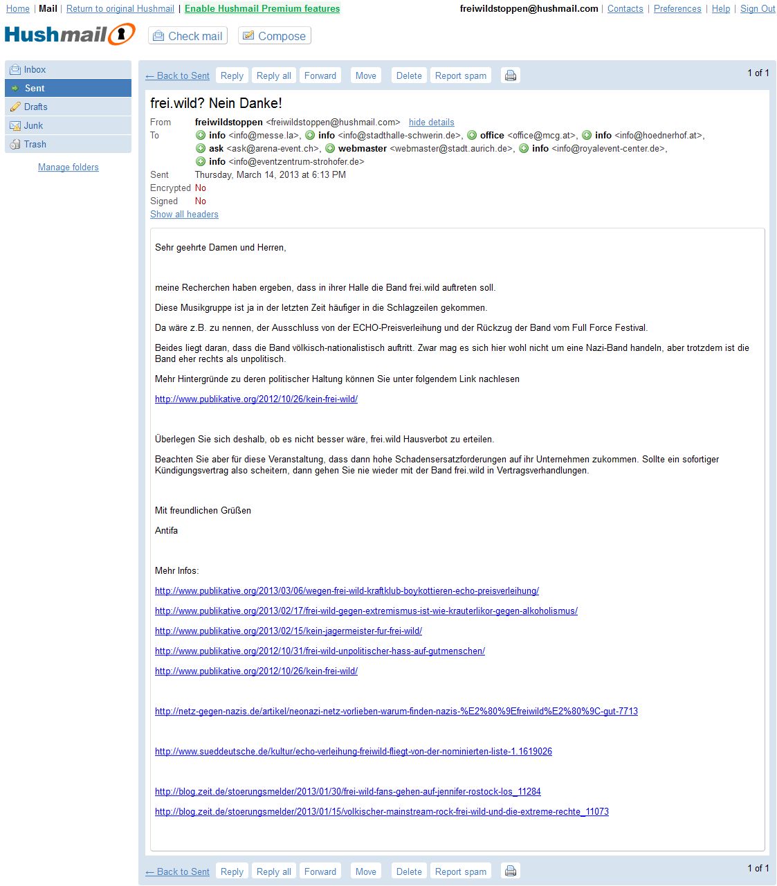 Die Band frei.wild hat doch noch ein paar kleinere Hallen (Vgl. zur letzten Tour) gefunden, wo sie auftreten darf. Um dem Entgegenzuwirken, schickt auch ihr das folgende Schreiben die Hallenbetreiber*innen, damit frei.wild kein Geld mehr durch Konzerte hoffentlich verdienen kann. Vielleicht klappt es ja durch ganz viele verschickte Emails eher.